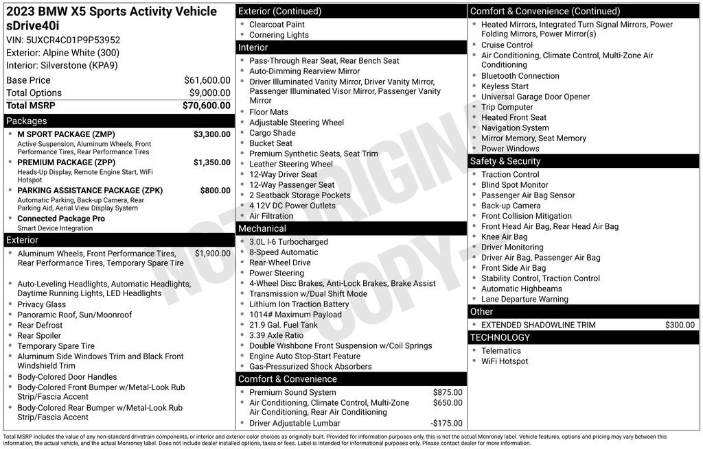 2023 BMW X5 sDrive40i Check out all these great option's Connected Package Pro, M Sport Package (Adaptive M Suspension, Aerodynamic Kit, High-Gloss Shadowline Roof Rails, M Steering Wheel, Shadowline Exterior Trim, Wheels: 20" x 9" M Star-Spoke Bi-Color, and Without Lines Designation Outside), M Sport Package (337), Parking Assistance Package (Active Park Distance Control, Drive Recorder, Parking Assistant Plus, Rear-View Camera, and Surround View w/3D View), Premium Package (Head-Up Display, Remote Engine Start, WiFi Hotspot, and Wireless Charging), 10 Speakers, 3.39 Axle Ratio, 4-Wheel Disc Brakes, 4-Zone Automatic Climate Control, ABS brakes, Air Conditioning, Alloy wheels, AM/FM radio: SiriusXM with 360L, AM/FM Stereo, Auto High-beam Headlights, Auto tilt-away steering wheel, Auto-dimming door mirrors, Auto-dimming Rear-View mirror, Automatic temperature control, BMW Assist eCall, BMW TeleServices, Brake assist, Bumpers: body-color, Compass, ConnectedDrive Services, Delay-off headlights, Driver door bin, Driver Lumbar Support Only (DISC), Driver vanity mirror, Dual front impact airbags, Dual front side impact airbags, Electronic Stability Control, Emergency communication system: BMW Assist eCall, Enhanced USB & Bluetooth w/Smartphone Integration, Extended Shadowline Trim, Exterior Parking Camera Rear, Four wheel independent suspension, Front anti-roll bar, Front Bucket Seats, Front Center Armrest, Front dual zone A/C, Front reading lights, Fully automatic headlights, Garage door transmitter, Genuine wood console insert, Genuine wood dashboard insert, Genuine wood door panel insert, harman/kardon Surround Sound System, Head restraints memory, Heated door mirrors, Heated Front Seats, Heated front seats, Hi-Fi Sound System, Illuminated entry, Increased Top Speed Limiter, Knee airbag, Leather Shift Knob, Leather steering wheel, Live Cockpit Pro w/Navigation, Low tire pressure warning, Lumbar Support, Memory seat, Navigation System, Occupant sensing airbag, Outside temperature display, Overhead airbag, Panic alarm, Passenger door bin, Passenger vanity mirror, Power adjustable front head restraints, Power door mirrors, Power driver seat, Power Front Seats, Power moonroof, Power passenger seat, Power steering, Power windows, Radio data system, Rain sensing wipers, Rear anti-roll bar, Rear reading lights, Rear seat center armrest, Rear window defroster, Rear window wiper, Remote keyless entry, Security system, Sensafin Upholstery, SiriusXM Satellite Radio, Speed control, Speed-sensing steering, Speed-Sensitive Wipers, Split folding rear seat, Spoiler, Sport Seats, Sport steering wheel, Steering wheel mounted audio controls, Tachometer, Telescoping steering wheel, Tilt steering wheel, Traction control, Trip computer, Turn signal indicator mirrors, Variably intermittent wipers, Wheels: 19" x 9" V-Spoke, and Wheels: 22" x 9.5" Fr & 22" x 10.5" Rr Black. Recent Arrival! 21/26 City/Highway MPG
