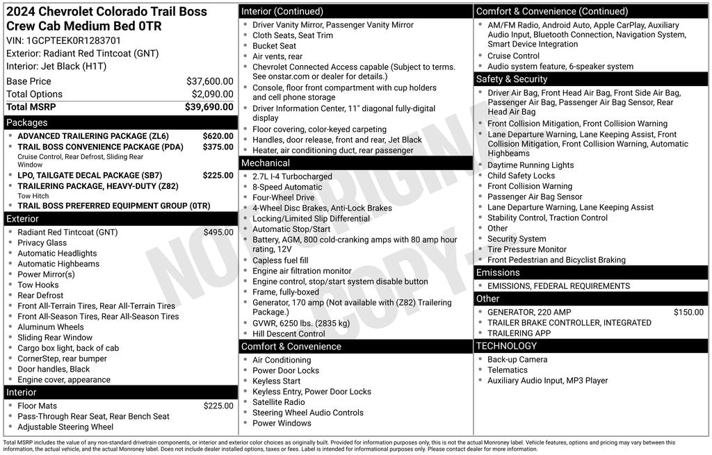 2024 Chevrolet Colorado Trail Boss Check out all these great option's Advanced Trailering Package (Trailering App), Heavy-Duty Trailering Package (Integrated Trailer Brake Controller), Preferred Equipment Group 0TR (Automatic Emergency Braking, Chevy Safety Assist, Following Distance Indicator, Forward Collision Alert, Front Pedestrian & Bicyclist Braking, IntelliBeam Automatic High Beam On/Off, and Lane Keep Assist w/Lane Departure Warning), Tailgate Decal Package (LPO), Trail Boss Convenience Package (Electronic Automatic Cruise Control, Manual Rear-Sliding Window, and Rear-Window Electric Defogger), 1st & 2nd Row All-Weather Floor Liner (LPO), 220 Amp Generator, 3.42 Rear Axle Ratio, 4-Way Manual Passenger Seat Adjuster, 4-Wheel Disc Brakes, 6 Speakers, 6-Speaker Audio System Feature, 6-Way Manual Driver Seat Adjuster, ABS brakes, Air Conditioning, Alloy wheels, AM/FM radio: SiriusXM, Apple CarPlay/Android Auto, Auto High-beam Headlights, Brake assist, Cloth Seat Trim, Compass, Delay-off headlights, Driver door bin, Driver vanity mirror, Dual front impact airbags, Dual front side impact airbags, Electronic Stability Control, Front anti-roll bar, Front Bucket Seats, Front Center Armrest, Front wheel independent suspension, Illuminated entry, Low tire pressure warning, Navigation System, Occupant sensing airbag, Outside temperature display, Overhead airbag, Overhead console, Panic alarm, Passenger door bin, Passenger vanity mirror, Power door mirrors, Power steering, Power windows, Radio data system, Radio: 11.3" Diagonal Advanced Color LCD Display, Rear reading lights, Rear step bumper, Remote keyless entry, Security system, SiriusXM Radio, Speed-sensing steering, Split folding rear seat, Steering Wheel Mounted Audio Controls, Steering wheel mounted audio controls, Tachometer, Tilt steering wheel, Traction control, Trip computer, Variably intermittent wipers, Wheels: 18" x 8.5" Black High Gloss Aluminum, and Wireless Phone Projection. Recent Arrival!