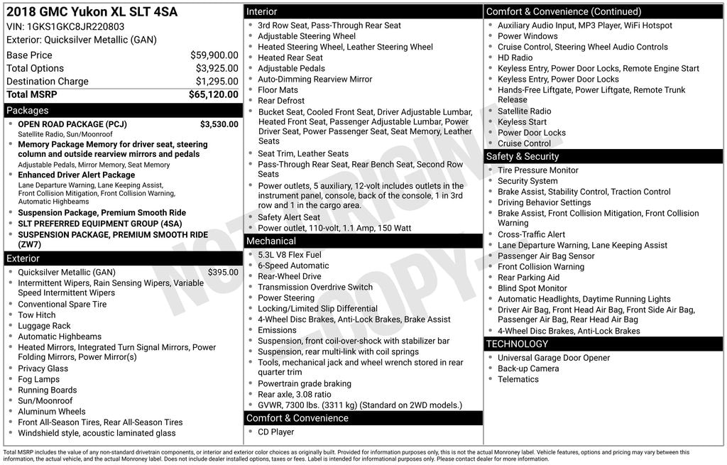 2018 GMC Yukon XL SLT Check out all these great option's Enhanced Driver Alert Package (Forward Collision Alert, IntelliBeam Automatic High Beam On/Off Headlamps, Lane Keep Assist w/Lane Departure Warning, and Low Speed Forward Automatic Braking), Memory Package, Open Road Package (3rd Row DVD Screen, CD Player, Power Tilt-Sliding Sunroof w/Express-Open/Close, Radio: AM/FM/SiriusXM w/Navigation, Rear Seat Blu-Ray/DVD Entertainment System, SiriusXM NavTraffic, and SiriusXM Satellite Radio), Preferred Equipment Group 4SA (4-Wheel Antilock Disc Brakes, 5 Auxiliary 12-volt Power Outlets, Black Assist Steps w/Chrome Strip, Hands Free Power Liftgate, Heated Leather-Wrapped Steering Wheel, Inside Rear-View Auto-Dimming Mirror, Lane Change Alert w/Side Blind Zone Alert, OnStar 4G LTE, OnStar Basic Plan For 5 Years, Passive Entry System, Power Release 2nd Row 60/40 Split-Folding Bench Seat, Power Tilt & Telescopic Steering Column, Power-Adjustable Pedals For Accelerator & Brake, Push Button Keyless Start, Rear Cross-Traffic Alert, Remote Keyless Entry, and Universal Home Remote), Premium Smooth Ride Suspension Package, 3.08 Rear Axle Ratio, 3rd row seats: split-bench, 4-Wheel Disc Brakes, 9 Speakers, ABS brakes, Adjustable pedals, Air Conditioning, Alloy wheels, AM/FM radio: SiriusXM, Apple CarPlay/Android Auto, Auto High-beam Headlights, Auto-dimming door mirrors, Auto-dimming Rear-View mirror, Automatic temperature control, Bose Premium 9-Speaker System, Brake assist, Bumpers: body-color, CD player, Compass, Delay-off headlights, Driver door bin, Driver vanity mirror, Dual front impact airbags, Dual front side impact airbags, Electronic Stability Control, Emergency communication system: OnStar and GMC connected services capable, Exterior Parking Camera Rear, Front anti-roll bar, Front Bucket Seats, Front Center Armrest, Front dual zone A/C, Front fog lights, Front reading lights, Front wheel independent suspension, Full-Feature Reclining Bucket Seats, Fully automatic headlights, Garage door transmitter: HomeLink, Heated & Ventilated Driver & Front Passenger Seats, Heated door mirrors, Heated front seats, Heated rear seats, Heated steering wheel, Illuminated entry, Low tire pressure warning, Memory seat, Occupant sensing airbag, Outside temperature display, Overhead airbag, Overhead console, Panic alarm, Passenger door bin, Passenger vanity mirror, Pedal memory, Perforated Leather-Appointed Seat Trim, Power door mirrors, Power driver seat, Power Liftgate, Power passenger seat, Power steering, Power windows, Premium audio system: IntelliLink, Radio: AM/FM/SiriusXM, Rain sensing wipers, Rear air conditioning, Rear anti-roll bar, Rear reading lights, Rear seat center armrest, Rear window defroster, Rear window wiper, Remote keyless entry, Roof rack: rails only, Security system, Speed control, Speed-sensing steering, Split folding rear seat, Spoiler, Steering wheel memory, Steering wheel mounted audio controls, Tachometer, Telescoping steering wheel, Tilt steering wheel, Traction control, Trip computer, Turn signal indicator mirrors, Variably intermittent wipers, Ventilated front seats, Voltmeter, and Wheels: 18" x 8.5" Bright Machined Aluminum. Recent Arrival!