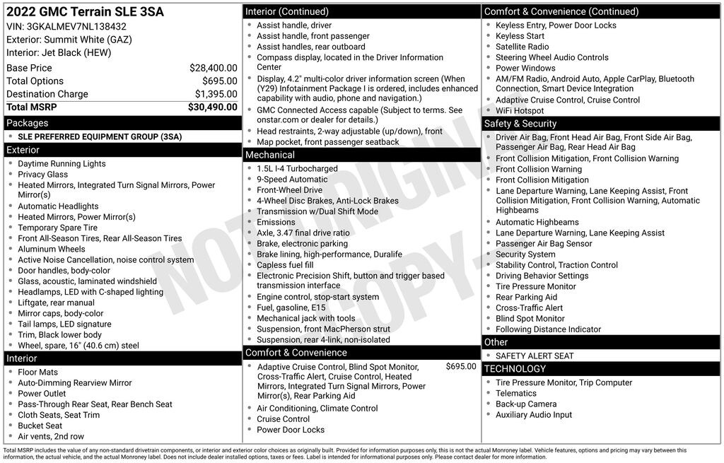 2022 GMC Terrain SLE Check out all these great option's GMC Pro Safety Plus (Adaptive Cruise Control, Lane Change Alert w/Side Blind Zone Alert, Outside Heated Power-Adjustable Mirrors, Rear Cross-Traffic Alert, Rear Park Assist, and Safety Alert Seat), Preferred Equipment Group 3SA, 2 USB Data Ports w/Auxiliary Input Jack, 3.47 Axle Ratio, 4-Way Manual Driver's Seat, 4-Way Manual Front Passenger Seat, 4-Wheel Disc Brakes, 4.2" Multi-Color Driver Information Screen, 6 Speakers, 6-Speaker Audio System Feature, ABS brakes, Air Conditioning, Alloy wheels, AM/FM radio: SiriusXM, Auto High-beam Headlights, Auto-dimming Rear-View mirror, Automatic temperature control, Bluetooth® For Phone, Brake assist, Bumpers: body-color, Compass, Delay-off headlights, Driver door bin, Driver vanity mirror, Dual front impact airbags, Dual front side impact airbags, Electronic Stability Control, Emergency communication system: OnStar Guidance, Four wheel independent suspension, Front anti-roll bar, Front Bucket Seats, Front Center Armrest, Front reading lights, Fully automatic headlights, Heated door mirrors, Illuminated entry, Low tire pressure warning, Occupant sensing airbag, Outside temperature display, Overhead airbag, Overhead console, Panic alarm, Passenger door bin, Passenger vanity mirror, Power door mirrors, Power steering, Power windows, Premium Cloth Seat Trim, Radio data system, Radio: GMC Infotainment Audio System w/7" Display, Rear anti-roll bar, Rear seat center armrest, Rear window defroster, Rear window wiper, Remote keyless entry, Security system, SiriusXM Radio, Speed control, Speed-sensing steering, Split folding rear seat, Spoiler, Steering wheel mounted audio controls, Tachometer, Telescoping steering wheel, Tilt steering wheel, Traction control, Trip computer, Variably intermittent wipers, Wheels: 17" x 7" Silver Painted Aluminum, and Wireless Apple CarPlay/Wireless Android Auto. Recent Arrival! 25/30 City/Highway MPG