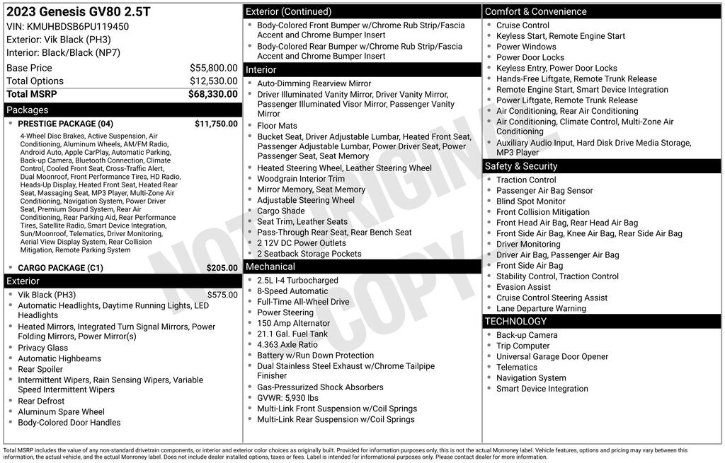 2023 Genesis GV80 2.5T Check out all these great option's Cargo Package (First Aid Kit and Seatback Cargo Mat), Prestige Package (12.3" 3D Digital Instrument Cluster, 3-Zone Climate Control, Blind-Spot View Monitor, Electronically Controlled Suspension, Ergo Motion Driver Seat, Forward Attention Warning, Head-Up Display, Heated 2nd Row Seats, Leather Seating Surfaces, Monobloc Front Brakes, Panoramic Sunroof, Parking Collision-Avoidance Assist, Power Cushion Extension & Bolster, Radio: AM/FM/SiriusXM/HD Lexicon Prem Audio System, Remote Smart Parking Assist, Road Active Noise Control, Surround View Monitor, Ventilated Front Seats, and Wheels: 22" x 9.5J Alloy), 12 Speakers, 4-Wheel Disc Brakes, 4.363 Axle Ratio, ABS brakes, Air Conditioning, Alloy wheels, AM/FM radio: SiriusXM, Android Auto & Apple CarPlay, Anti-whiplash front head restraints, Auto High-beam Headlights, Auto tilt-away steering wheel, Auto-dimming door mirrors, Auto-dimming Rear-View mirror, Auto-leveling suspension, Automatic temperature control, Brake assist, Bumpers: body-color, Compass, Delay-off headlights, Driver door bin, Driver vanity mirror, Dual front impact airbags, Dual front side impact airbags, Electronic Stability Control, Emergency communication system: Genesis Connected Services, Exterior Parking Camera Rear, Four wheel independent suspension, Front anti-roll bar, Front Bucket Seats, Front Center Armrest, Front dual zone A/C, Front reading lights, Fully automatic headlights, Garage door transmitter: HomeLink, Genuine wood console insert, Genuine wood dashboard insert, Genuine wood door panel insert, Heated door mirrors, Heated Front Bucket Seats, Heated front seats, Heated steering wheel, Illuminated entry, Knee airbag, Leather steering wheel, Leatherette Seating Surfaces, Low tire pressure warning, Memory seat, Navigation System, Occupant sensing airbag, Outside temperature display, Overhead airbag, Overhead console, Panic alarm, Passenger door bin, Passenger vanity mirror, Power door mirrors, Power driver seat, Power Liftgate, Power passenger seat, Power steering, Power windows, Radio data system, Radio: AM/FM/SiriusXM/HD Audio System, Rain sensing wipers, Rear air conditioning, Rear anti-roll bar, Rear reading lights, Rear seat center armrest, Rear side impact airbag, Rear window defroster, Rear window wiper, Remote keyless entry, Security system, Speed control, Speed-sensing steering, Speed-Sensitive Wipers, Split folding rear seat, Spoiler, Steering wheel memory, Steering wheel mounted audio controls, Tachometer, Telescoping steering wheel, Tilt steering wheel, Traction control, Trip computer, Turn signal indicator mirrors, Variably intermittent wipers, Wheels: 19" x 8.5J Medium Metallic Gray Alloy, and Wheels: 20" x 8.5J Medium Metallic Gray Alloy. Recent Arrival!