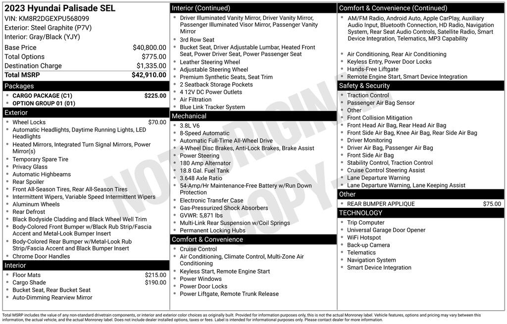 2023 Hyundai Palisade SEL Check out all these great option's Cargo Package (Cargo Blocks, Cargo Net, and Cargo Tray), Option Group 01, 3.648 Axle Ratio, 3rd row seats: split-bench, 4-Wheel Disc Brakes, 6 Speakers, ABS brakes, Air Conditioning, Alloy wheels, AM/FM radio: SiriusXM, Apple CarPlay & Android Auto, Auto High-beam Headlights, Auto-dimming door mirrors, Auto-dimming Rear-View mirror, Automatic temperature control, Brake assist, Bumpers: body-color, Cargo Cover/Screen, Carpeted Floor Mats, Delay-off headlights, Driver door bin, Driver vanity mirror, Dual front impact airbags, Dual front side impact airbags, Electronic Stability Control, Emergency communication system: Blue Link Connected Car Service (3-year complimentary subscription), Exterior Parking Camera Rear, Four wheel independent suspension, Front anti-roll bar, Front Bucket Seats, Front Center Armrest, Front dual zone A/C, Front reading lights, Fully automatic headlights, Garage door transmitter: HomeLink, H-Tex Leatherette Seat Trim, Heated door mirrors, Heated Front Bucket Seats, Heated front seats, Illuminated entry, Knee airbag, Low tire pressure warning, Navigation System, Occupant sensing airbag, Outside temperature display, Overhead airbag, Overhead console, Panic alarm, Passenger door bin, Passenger vanity mirror, Power door mirrors, Power driver seat, Power Liftgate, Power passenger seat, Power steering, Power windows, Radio data system, Radio: AM/FM/MP3 Audio System, Rear air conditioning, Rear anti-roll bar, Rear audio controls, Rear Bumper Applique, Rear reading lights, Rear side impact airbag, Rear window defroster, Rear window wiper, Reclining 3rd row seat, Remote keyless entry, Security system, Speed control, Speed-sensing steering, Split folding rear seat, Spoiler, Steering wheel mounted audio controls, Tachometer, Telescoping steering wheel, Tilt steering wheel, Traction control, Trip computer, Turn signal indicator mirrors, Variably intermittent wipers, Wheel Locks, and Wheels: 18" x 7.5J Machine-Faced Alloy. Recent Arrival!