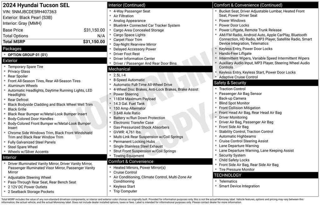 2024 Hyundai Tucson SEL Check out all these great option's Option Group 01, 3.648 Axle Ratio, 4-Wheel Disc Brakes, 6 Speakers, ABS brakes, Air Conditioning, Alloy wheels, AM/FM radio: SiriusXM, Apple CarPlay & Android Auto, Auto High-beam Headlights, Automatic temperature control, Brake assist, Bumpers: body-color, Delay-off headlights, Driver door bin, Driver vanity mirror, Dual front impact airbags, Dual front side impact airbags, Electronic Stability Control, Emergency communication system: Blue Link Connected Car Service (3-year complimentary subscription), Exterior Parking Camera Rear, Four wheel independent suspension, Front anti-roll bar, Front Bucket Seats, Front Center Armrest, Front dual zone A/C, Front reading lights, Fully automatic headlights, Heated door mirrors, Heated Front Bucket Seats, Heated front seats, Illuminated entry, Low tire pressure warning, Occupant sensing airbag, Outside temperature display, Overhead airbag, Overhead console, Panic alarm, Passenger door bin, Passenger vanity mirror, Power door mirrors, Power driver seat, Power Liftgate, Power steering, Power windows, Radio data system, Radio: AM/FM/HD Audio System, Rear anti-roll bar, Rear seat center armrest, Rear side impact airbag, Rear window defroster, Rear window wiper, Remote keyless entry, Roof rack: rails only, Security system, Speed control, Split folding rear seat, Spoiler, Stain & Odor Resistant Cloth Seat Trim, Steering wheel mounted audio controls, Tachometer, Telescoping steering wheel, Tilt steering wheel, Traction control, Trip computer, Variably intermittent wipers, Wheels: 17" x 7.0J" Alloy, and Wheels: 19" x 7.5J" Machine-Face Finish Alloy. Recent Arrival! 23/29 City/Highway MPG