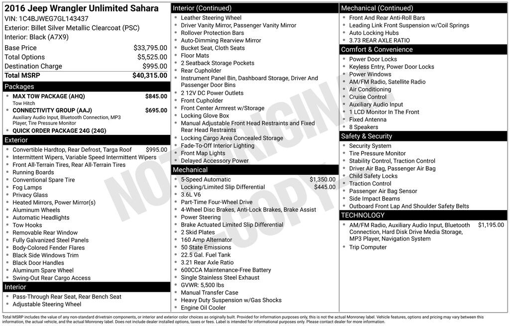 2016 Jeep Wrangler Unlimited Sahara Check out all these great option's Connectivity Group (Leather Wrapped Steering Wheel, Remote USB Port, Tire Pressure Monitoring Display, Uconnect Voice Command w/Bluetooth, and Vehicle Information Center), Max Tow Package (Class II Receiver Hitch and Trailer Tow w/4-Pin Connector Wiring), Quick Order Package 24G (Body Color Appliques Front Bumper, Body Color Appliques Rear Bumper, and Body Color/Accent Color Grille), 18" x 7.5" Polished Satin Carbon Wheels, 4-Wheel Disc Brakes, 40GB Hard Drive w/28GB Available, 5-Year SiriusXM Travel Link Service, 6.5" Touchscreen Display, 8 Speakers, ABS brakes, Air Conditioning, Alloy wheels, AM/FM radio: SiriusXM, Anti-Spin Differential Rear Axle, Audio Jack Input for Mobile Devices, Auto-dimming Rear-View mirror, Black 3-Piece Hard Top, Brake assist, CD player, Cloth Seats w/Adjustable Head Restraints, Compass, Driver door bin, Driver vanity mirror, Dual front impact airbags, Electronic Stability Control, Freedom Panel Storage Bag, Front anti-roll bar, Front Bucket Seats, Front Center Armrest w/Storage, Front fog lights, Front reading lights, Fully automatic headlights, GPS Navigation, Heated door mirrors, Heavy Duty Suspension w/Gas Shocks, Illuminated entry, Integrated roll-over protection, Leather steering wheel, Low tire pressure warning, Occupant sensing airbag, Outside temperature display, Panic alarm, Passenger door bin, Passenger vanity mirror, Power door mirrors, Power steering, Power windows, Radio data system, Radio: 130, Radio: 430N, Rear anti-roll bar, Rear Window Defroster, Rear Window Wiper/Washer, Remote keyless entry, Security system, SiriusXM Travel Link, Speed control, Split folding rear seat, Steering wheel mounted audio controls, Sunrider Soft Top, Tachometer, Tilt steering wheel, Traction control, Trip computer, Tubular Side Steps (DISC), and Variably intermittent wipers. Recent Arrival!