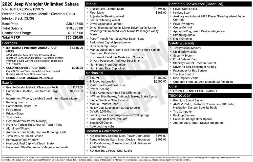 2020 Jeep Wrangler Unlimited Sahara Check out all these great option's 8.4" Radio & Premium Audio Group (1-Year SiriusXM Guardian Trial, 4G LTE Wi-Fi Hot Spot, 5-Year SiriusXM Traffic Service, 5-Year SiriusXM Travel Link Service, 8.4" Touchscreen Display, Alpine Premium Audio System, Auto-Dimming Rear-View Mirror, Emergency/Assistance Call, For Details, Visit DriveUconnect.com, GPS Navigation, HD Radio, Radio: Uconnect 4C Nav w/8.4" Display, SiriusXM Traffic Plus, and SiriusXM Travel Link), Cold Weather Group (Heated Front Seats and Heated Steering Wheel), Quick Order Package 25G, 1-Year SiriusXM Radio Service, 3.45 Rear Axle Ratio, 4-Wheel Disc Brakes, 8 Speakers, ABS brakes, Air Conditioning, Alloy wheels, AM/FM radio: SiriusXM, Apple CarPlay, Apple CarPlay/Android Auto, Automatic temperature control, Aux Battery, Black 3-Piece Hard Top, Brake assist, Cloth Low-Back Bucket Seats, Compass, Delay-off headlights, Driver door bin, Driver vanity mirror, Dual front impact airbags, Dual front side impact airbags, Electronic Stability Control, Freedom Panel Storage Bag, Front anti-roll bar, Front Bucket Seats, Front Center Armrest w/Storage, Front dual zone A/C, Front fog lights, Front License Plate Bracket, Front reading lights, Fully automatic headlights, Garage door transmitter, Google Android Auto, GPS Antenna Input, Heated door mirrors, Heavy Duty Suspension w/Gas Shocks, Illuminated entry, Integrated roll-over protection, Integrated Voice Command w/Bluetooth, Leather steering wheel, Low tire pressure warning, MOPAR All-Weather Floor Mats (DISC), No Soft Top, Non-Lock Fuel Cap w/o Discriminator, Occupant sensing airbag, Outside temperature display, Panic alarm, ParkView Rear Back-Up Camera, Passenger door bin, Passenger vanity mirror, Power door mirrors, Power steering, Power windows, Radio data system, Radio: Uconnect 4 w/7" Display, Rear anti-roll bar, Rear reading lights, Rear Window Defroster, Rear Window Wiper/Washer, Remote keyless entry, Remote Proximity Keyless Entry, Remote Start System, Security system, Speed control, Split folding rear seat, Steering wheel mounted audio controls, Stop-Start Dual Battery System, Tachometer, Telescoping steering wheel, Tilt steering wheel, Traction control, Trip computer, Variably intermittent wipers, Voltmeter, and Wheels: 18" x 7.5" Polished w/Gray SpokeS. Recent Arrival!
