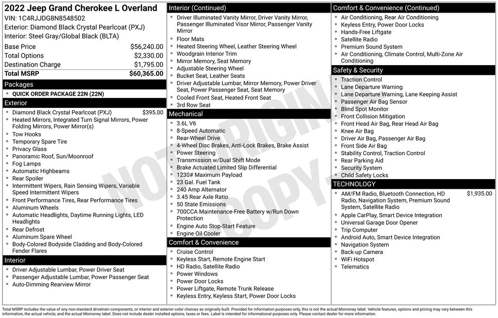 2022 Jeep Grand Cherokee L Overland Check out all these great option's Quick Order Package 22N, 10 Speakers, 10.1" Touchscreen Display, 19 Speakers High Performance Audio, 3.45 Rear Axle Ratio, 3rd row seats: split-bench, 4-Wheel Disc Brakes, 4G LTE Wi-Fi Hot Spot, 950 Watt Amplifier, ABS brakes, Active Noise Control System, Air Conditioning, All Radio Equipped Vehicles, Alloy wheels, AM/FM radio: SiriusXM with 360L, Anti-whiplash front head restraints, Apple CarPlay, Audio memory, Auto High-beam Headlights, Auto-dimming door mirrors, Auto-dimming Rear-View mirror, Automatic temperature control, Brake assist, Bumpers: body-color, Compass, Connected Travel & Traffic Services, Connectivity - US/Canada, Delay-off headlights, Disassociated Touchscreen Display, Driver door bin, Driver vanity mirror, Dual front impact airbags, Dual front side impact airbags, Electronic Stability Control, Emergency communication system, For Details, Visit DriveUconnect.com, For More Info, Call 800-643-2112, Four wheel independent suspension, Front anti-roll bar, Front Bucket Seats, Front Center Armrest w/Storage, Front dual zone A/C, Front fog lights, Front reading lights, Fully automatic headlights, Garage door transmitter, Global Telematics Box Module (TBM), Google Android Auto, GPS Antenna Input, GPS Navigation, HD Radio, Heated door mirrors, Heated front seats, Heated rear seats, Heated steering wheel, Illuminated entry, Integrated Center Stack Radio, Integrated Voice Command w/Bluetooth, Knee airbag, Leather steering wheel, Low tire pressure warning, Memory seat, Nappa Leather Seats, Navigation System, Normal Duty Suspension, Occupant sensing airbag, Outside temperature display, Overhead airbag, Overhead console, Panic alarm, Passenger door bin, Passenger vanity mirror, Power door mirrors, Power driver seat, Power Fold Seatbacks, Power Liftgate, Power moonroof, Power passenger seat, Power steering, Power windows, Radio data system, Radio: Uconnect 5 Nav w/10.1" Display, Radio: Uconnect 5 Nav w/8.4" Display, Rain sensing wipers, Rear air conditioning, Rear anti-roll bar, Rear reading lights, Rear window defroster, Rear window wiper, Reclining 3rd row seat, Remote keyless entry, Security system, SiriusXM Radio Service, SiriusXM Satellite Radio, SiriusXM w/360L, Speed control, Speed-Sensitive Wipers, Split folding rear seat, Spoiler, Steering wheel memory, Steering wheel mounted audio controls, Tachometer, Telescoping steering wheel, Tilt steering wheel, Traction control, Trip computer, Turn signal indicator mirrors, USB Host Flip, Variably intermittent wipers, Ventilated front seats, Voltmeter, and Wheels: 20" x 8.5" Machined Face AluminuM. Recent Arrival! 19/26 City/Highway MPG