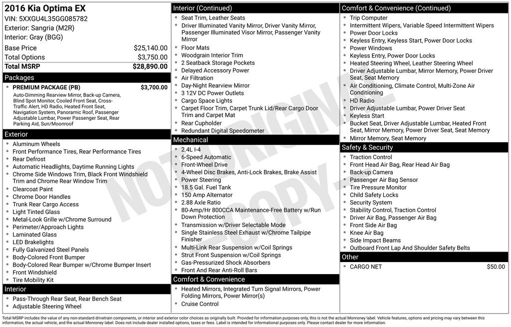 2016 Kia Optima EX Check out all these great option's Premium Package (10-Way Power Front Passenger Seat, 8" Navigation System, Heated & Ventilated Front Seats, LED Overhead Front & Rear Reading Lamps, Panoramic Sunroof, Rear Camera Display, Rear Cross Traffic Alert, and Rear Parking Assist System), 17" Alloy Wheels, 4-Wheel Disc Brakes, 6 Speakers, ABS brakes, Air Conditioning, Alloy wheels, AM/FM radio: SiriusXM, AM/FM/CD/MP3 Radio, Automatic temperature control, Brake assist, Bumpers: body-color, Cargo Net, CD player, Delay-off headlights, Driver door bin, Driver vanity mirror, Dual front impact airbags, Dual front side impact airbags, Electronic Stability Control, Exterior Parking Camera Rear, Four wheel independent suspension, Front anti-roll bar, Front Bucket Seats, Front Center Armrest, Front dual zone A/C, Front reading lights, Fully automatic headlights, Heated door mirrors, Heated Front Bucket Seats, Heated front seats, Heated steering wheel, Illuminated entry, Knee airbag, Leather Seat Trim, Leather Shift Knob, Leather steering wheel, Low tire pressure warning, Memory seat, Occupant sensing airbag, Outside temperature display, Overhead airbag, Overhead console, Panic alarm, Passenger door bin, Passenger vanity mirror, Power door mirrors, Power driver seat, Power steering, Power windows, Rear anti-roll bar, Rear reading lights, Rear seat center armrest, Rear window defroster, Remote keyless entry, Security system, Speed control, Speed-sensing steering, Split folding rear seat, Steering wheel mounted audio controls, Tachometer, Telescoping steering wheel, Tilt steering wheel, Traction control, Trip computer, Turn signal indicator mirrors, and Variably intermittent wipers. Recent Arrival! 24/35 City/Highway MPG
