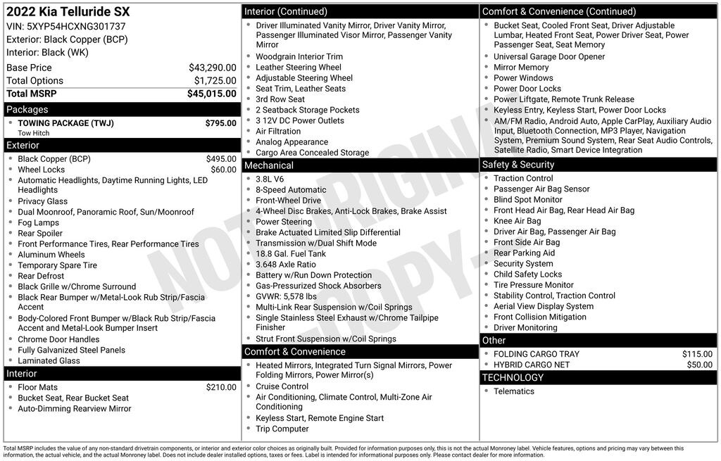 2022 Kia Telluride SX Check out all these great option's Towing Package (Self Leveling Rear Suspension and Tow Hitch w/Harness (TOF)), 10 Speakers, 3.648 Axle Ratio, 3rd row seats: split-bench, 4-Wheel Disc Brakes, ABS brakes, Air Conditioning, Alloy wheels, AM/FM radio: SiriusXM, Apple CarPlay & Android Auto, Auto High-beam Headlights, Auto-dimming Rear-View mirror, Automatic temperature control, Black Wheel Lock, Brake assist, Bumpers: body-color, Carpeted Floor Mats, Compass, Delay-off headlights, Driver door bin, Driver vanity mirror, Dual front impact airbags, Dual front side impact airbags, Electronic Stability Control, Emergency communication system: 911 Connect, Folding Cargo Tray, Four wheel independent suspension, Front anti-roll bar, Front Bucket Seats, Front Center Armrest, Front dual zone A/C, Front fog lights, Front reading lights, Fully automatic headlights, Garage door transmitter: HomeLink, harman/kardon® Speakers, Heated & Ventilated Front Bucket Seats, Heated door mirrors, Heated front seats, Hybrid Cargo Net, Illuminated entry, Knee airbag, Leather Seat Trim, Leather Shift Knob, Leather steering wheel, Low tire pressure warning, Memory seat, Navigation System, Occupant sensing airbag, Outside temperature display, Overhead airbag, Overhead console, Panic alarm, Passenger door bin, Passenger vanity mirror, Power door mirrors, Power driver seat, Power Liftgate, Power moonroof, Power passenger seat, Power steering, Power windows, Radio data system, Radio: AM/FM harman/kardon Audio System, Rear air conditioning, Rear anti-roll bar, Rear audio controls, Rear reading lights, Rear window defroster, Rear window wiper, Reclining 3rd row seat, Remote keyless entry, Roof rack: rails only, Security system, Smart Key w/ Push Button and Remote Start, Speed control, Speed-sensing steering, Split folding rear seat, Spoiler, Steering wheel mounted audio controls, Tachometer, Telescoping steering wheel, Tilt steering wheel, Traction control, Trip computer, Turn signal indicator mirrors, Variably intermittent wipers, Ventilated front seats, and Wheels: 20" x 7.5" Black Alloy. Recent Arrival! 20/26 City/Highway MPG