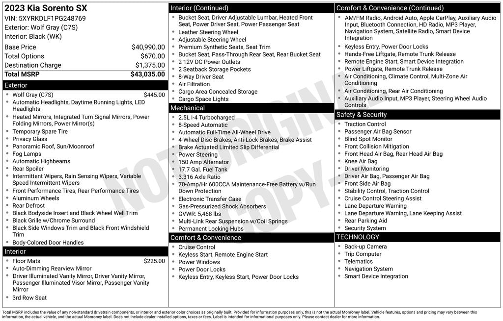 2023 Kia Sorento SX Check out all these great option's 3.316 Axle Ratio, 3rd row seats: split-bench, 4-Wheel Disc Brakes, 6 Speakers, ABS brakes, Air Conditioning, Alloy wheels, AM/FM radio: SiriusXM, Apple CarPlay & Android Auto, Auto High-beam Headlights, Auto-dimming Rear-View mirror, Automatic temperature control, Brake assist, Bumpers: body-color, Carpet Floor Mats, Delay-off headlights, Driver door bin, Driver vanity mirror, Dual front impact airbags, Dual front side impact airbags, Electronic Stability Control, Emergency communication system, Exterior Parking Camera Rear, Four wheel independent suspension, Front anti-roll bar, Front Bucket Seats, Front Center Armrest, Front dual zone A/C, Front fog lights, Front reading lights, Fully automatic headlights, Heated door mirrors, Heated Front Bucket Seats, Heated front seats, Illuminated entry, Knee airbag, Leather steering wheel, Low tire pressure warning, Navigation System, Occupant sensing airbag, Outside temperature display, Overhead airbag, Overhead console, Panic alarm, Passenger door bin, Passenger vanity mirror, Power door mirrors, Power driver seat, Power Liftgate, Power moonroof, Power passenger seat, Power steering, Power windows, Radio data system, Radio: AM/FM Audio System, Rain sensing wipers, Rear air conditioning, Rear anti-roll bar, Rear reading lights, Rear window defroster, Rear window wiper, Remote keyless entry, Roof rack: rails only, Security system, Smart Key w/ Push Button and Remote Start, Speed control, Speed-sensing steering, Split folding rear seat, Spoiler, Steering wheel mounted audio controls, SynTex Artificial Leather Seat Trim, Tachometer, Telescoping steering wheel, Tilt steering wheel, Traction control, Trip computer, Turn signal indicator mirrors, Variably intermittent wipers, and Wheels: 8.5J x 20" Gloss Black Alloy. Recent Arrival! 22/27 City/Highway MPG
