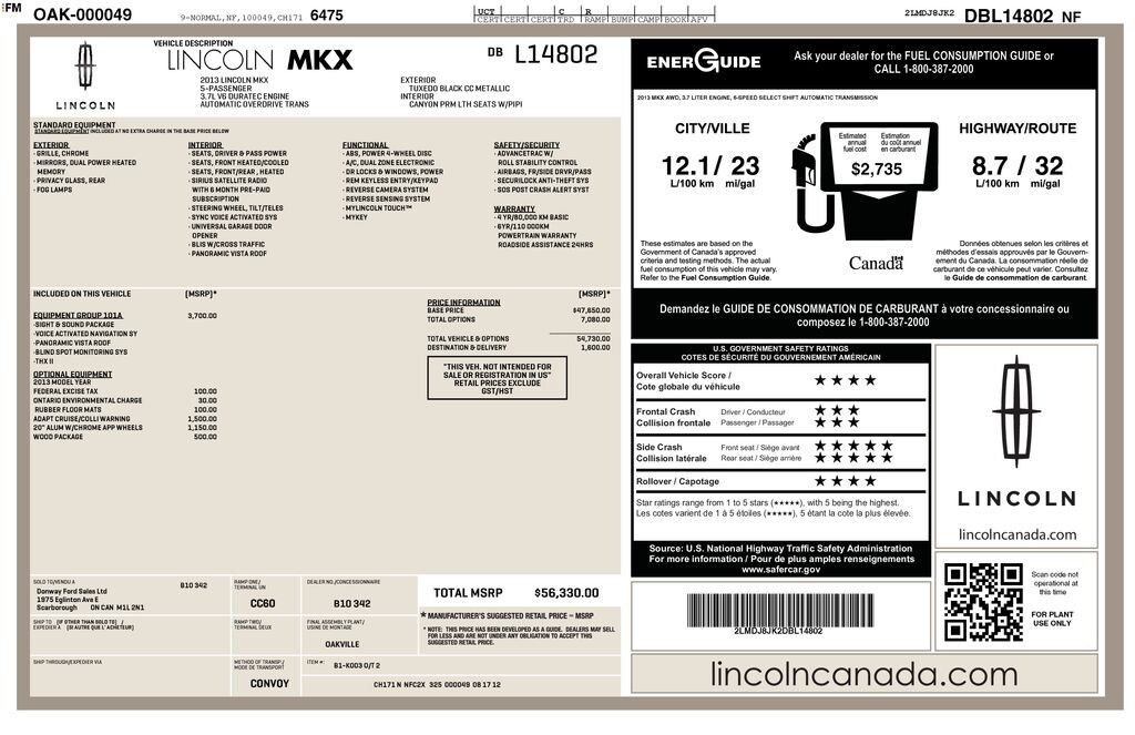 2013 Lincoln MKX Base Check out all these great option's 10 Speakers, 18" Premium Painted Aluminum Wheels, 3.39 Axle Ratio, 4-Wheel Disc Brakes, ABS brakes, Air Conditioning, Alloy wheels, AM/FM radio: SIRIUS, Auto-dimming door mirrors, Auto-dimming Rear-View mirror, Automatic temperature control, Brake assist, Bumpers: body-color, CD player, Compass, Delay-off headlights, Driver door bin, Driver vanity mirror, Dual front impact airbags, Dual front side impact airbags, Electronic Stability Control, Four wheel independent suspension, Front anti-roll bar, Front Bucket Seats, Front Center Armrest, Front dual zone A/C, Front fog lights, Front reading lights, Fully automatic headlights, Garage door transmitter: HomeLink, Heated door mirrors, Heated front seats, Illuminated entry, Low tire pressure warning, Memory seat, Occupant sensing airbag, Outside temperature display, Overhead airbag, Overhead console, Panic alarm, Passenger door bin, Passenger vanity mirror, Perforated Leather-Trimmed Bucket Seats, Power door mirrors, Power driver seat, Power Liftgate, Power passenger seat, Power steering, Power windows, Radio data system, Radio: Premium AM/FM Stereo/CD/MP3, Rear anti-roll bar, Rear Parking Sensors, Rear reading lights, Rear seat center armrest, Rear window defroster, Rear window wiper, Remote keyless entry, Security system, SIRIUS Satellite Radio, Speed control, Speed-Sensitive Wipers, Split folding rear seat, Spoiler, Steering wheel mounted A/C controls, Steering wheel mounted audio controls, Tachometer, Telescoping steering wheel, Tilt steering wheel, Traction control, Trip computer, Variably intermittent wipers, and Ventilated front seats. Recent Arrival!
