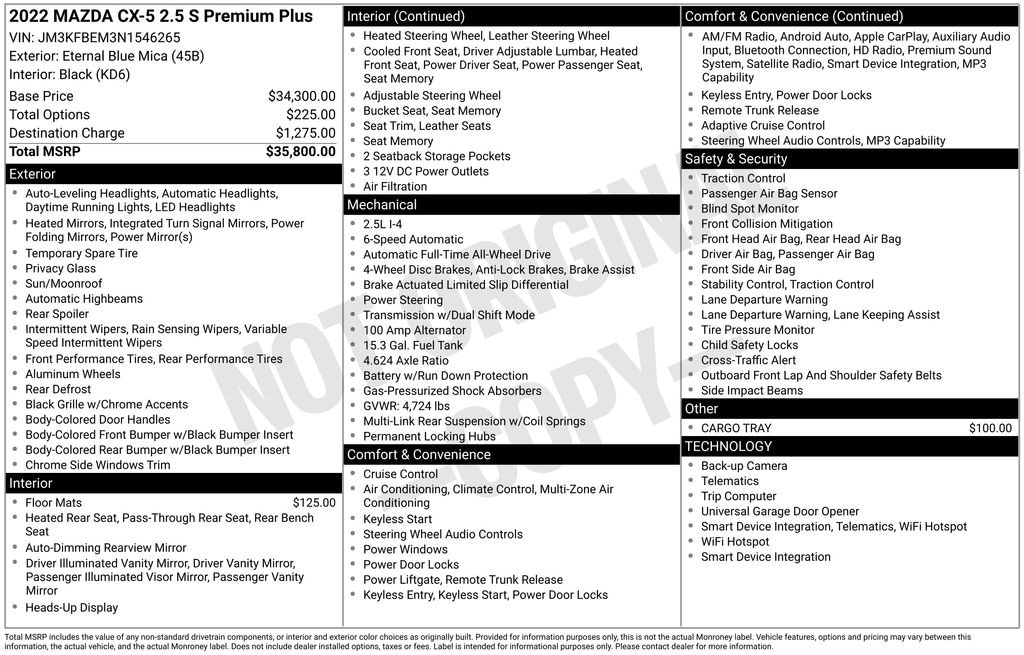 2022 Mazda CX-5 2.5 S Premium Plus Package Check out all these great option's 10 Speakers, 4-Wheel Disc Brakes, 4.624 Axle Ratio, ABS brakes, Air Conditioning, All-Weather Floor Mats, Alloy wheels, AM/FM radio: SiriusXM, AppLink/Apple CarPlay and Android Auto, Auto High-beam Headlights, Auto-dimming Rear-View mirror, Automatic temperature control, Brake assist, Bumpers: body-color, Cargo Storage Shelf, Cargo Tray, Delay-off headlights, Driver door bin, Driver vanity mirror, Dual front impact airbags, Dual front side impact airbags, E911 Automatic Emergency Notification, Electronic Stability Control, Emergency communication system: MAZDA CONNECT, Exterior Parking Camera Rear, Four wheel independent suspension, Front anti-roll bar, Front Bucket Seats, Front Center Armrest w/Storage, Front dual zone A/C, Front reading lights, Fully automatic headlights, Garage door transmitter: HomeLink, Heads-Up Display, Heated door mirrors, Heated front seats, Heated rear seats, Heated steering wheel, Heated/Ventilated Front Bucket Seats, Illuminated entry, Infotainment System Voice Command, Leather Seat Trim, Leather Shift Knob, Low tire pressure warning, Memory seat, Multifunction Commander Control, Occupant sensing airbag, Outside temperature display, Overhead airbag, Overhead console, Pandora, Panic alarm, Passenger door bin, Passenger vanity mirror, Power door mirrors, Power driver seat, Power Liftgate, Power moonroof, Power passenger seat, Power steering, Power windows, Premium audio system: Bose, Radio Broadcast Data System Program Information, Radio data system, Radio: AM/FM/HD Audio System, Rain sensing wipers, Rear anti-roll bar, Rear reading lights, Rear seat center armrest, Rear window defroster, Rear window wiper, Remote keyless entry, SMS Text Msg Audio Delivery & Reply, Speed control, Speed-sensing steering, Split folding rear seat, Spoiler, Steering wheel mounted audio controls, Tachometer, Telescoping steering wheel, Tilt steering wheel, Traction control, Trip computer, Turn signal indicator mirrors, Variably intermittent wipers, Ventilated front seats, and Wheels: 19" x 7J Aluminum Alloy. Recent Arrival! 24/30 City/Highway MPG