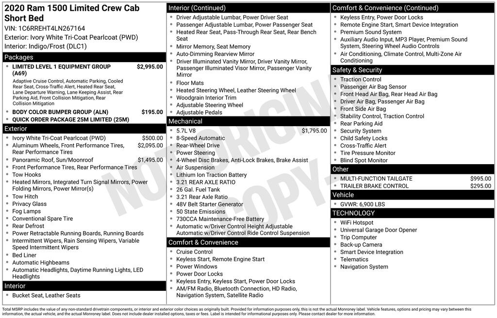 2020 Ram 1500 Limited Check out all these great option's Body Color Bumper Group (Body Color Front Bumper and Body Color Rear Bumper w/Step Pads), Limited Level 1 Equipment Group (Adaptive Cruise Control w/Stop & Go, Full Speed Forward Collision Warning Plus, Lane Keep Assist, Parallel & Perp Park Assist w/Stop, and Ventilated Rear Seats), Quick Order Package 25M Limited, 10 Speakers, 3.21 Rear Axle Ratio, 4-Wheel Disc Brakes, 48V Belt Starter Generator, ABS brakes, Adjustable pedals, Air Conditioning, Alloy wheels, AM/FM radio: SiriusXM with 360L, Apple CarPlay/Android Auto, Audio memory, Auto High-beam Headlights, Auto-dimming door mirrors, Auto-dimming Rear-View mirror, Auto-leveling suspension, Automatic temperature control, Bodyside moldings, Brake assist, Bumpers: chrome, Compass, Delay-off headlights, Dome Dual LED Reading Lamp, Driver door bin, Driver vanity mirror, Dual front impact airbags, Dual front side impact airbags, Dual-Pane Panoramic Sunroof, Electronic Stability Control, Emergency communication system: SiriusXM Guardian, Front anti-roll bar, Front Bucket Seats, Front Center Armrest w/Storage, Front dual zone A/C, Front fog lights, Front reading lights, Front wheel independent suspension, Fully automatic headlights, Garage door transmitter, Genuine wood console insert, Genuine wood dashboard insert, Genuine wood door panel insert, Heated door mirrors, Heated front seats, Heated rear seats, Heated steering wheel, Illuminated entry, Leather steering wheel, LED Dome/Reading Lamp, Low tire pressure warning, Memory seat, Multi-Function Tailgate, Navigation System, Occupant sensing airbag, Outside temperature display, Overhead airbag, Overhead console, Panic alarm, ParkView Rear Back-Up Camera, Passenger door bin, Passenger vanity mirror, Pedal memory, Power door mirrors, Power driver seat, Power passenger seat, Power steering, Power windows, Premium Leather Trimmed Bucket Seats, Radio data system, Radio: Uconnect 12 w/Navigation, Rain sensing wipers, Rear anti-roll bar, Rear seat center armrest, Rear step bumper, Rear window defroster, Remote keyless entry, Security system, Speed control, Split folding rear seat, Steering wheel mounted audio controls, Tachometer, Telescoping steering wheel, Tilt steering wheel, Traction control, Trailer Brake Control, Trip computer, Turn signal indicator mirrors, Variably intermittent wipers, Ventilated front seats, Voltmeter, Wheels: 20" x 9" Polished w/Inserts, and Wheels: 22" x 9" Polish/Painted w/Inserts. Recent Arrival!
