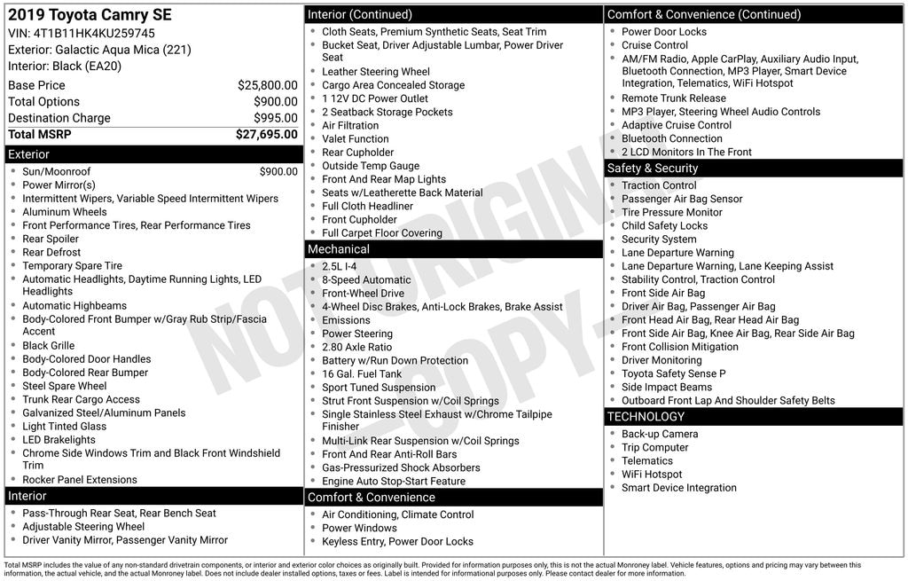 2019 Toyota Camry L Check out all these great option's 4-Wheel Disc Brakes, 6 Speakers, 6.5J x 16" Steel Wheels, ABS brakes, Air Conditioning, AM/FM radio, Apple CarPlay, Auto High-beam Headlights, Brake assist, Bumpers: body-color, Delay-off headlights, Driver door bin, Driver vanity mirror, Dual front impact airbags, Dual front side impact airbags, Electronic Stability Control, Emergency communication system: Safety Connect, Exterior Parking Camera Rear, Fabric Seat Trim, Four wheel independent suspension, Front anti-roll bar, Front Bucket Seats, Front Center Armrest, Front reading lights, Fully automatic headlights, Illuminated entry, Knee airbag, Low tire pressure warning, Occupant sensing airbag, Outside temperature display, Overhead airbag, Overhead console, Panic alarm, Passenger door bin, Passenger vanity mirror, Power door mirrors, Power steering, Power windows, Radio data system, Radio: Entune 3.0 Audio w/App Suite, Rear anti-roll bar, Rear reading lights, Rear side impact airbag, Rear window defroster, Remote keyless entry, Speed control, Speed-sensing steering, Steering wheel mounted audio controls, Tachometer, Telescoping steering wheel, Tilt steering wheel, Traction control, Trip computer, and Variably intermittent wipers. Recent Arrival! 29/41 City/Highway MPG