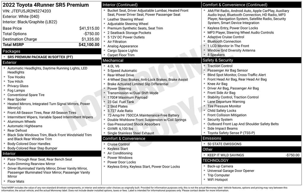 2022 Toyota 4Runner SR5 Premium Check out all these great option's 17" 6-Spoke Alloy Wheels, 3.727 Axle Ratio, 4-Wheel Disc Brakes, 8 Speakers, ABS brakes, Air Conditioning, Alloy wheels, AM/FM radio: SiriusXM, Anti-whiplash front head restraints, Apple CarPlay/Android Auto, Auto High-beam Headlights, Auto-dimming Rear-View mirror, Blind Spot Monitor (BSM), Brake assist, Bumpers: body-color, Compass, Driver door bin, Driver vanity mirror, Dual front impact airbags, Dual front side impact airbags, Electronic Stability Control, Emergency communication system: Safety Connect with 1-year trial, Exterior Parking Camera Rear, Front anti-roll bar, Front Bucket Seats, Front Center Armrest, Front fog lights, Front reading lights, Front wheel independent suspension, Garage Door Opener, Garage door transmitter: HomeLink, Heated door mirrors, Heated Front Bucket Seats, Heated front seats, Illuminated entry, Knee airbag, Leather Shift Knob, Leather steering wheel, Low tire pressure warning, Navigation System, Occupant sensing airbag, Outside Rear View Mirror, Outside temperature display, Overhead airbag, Overhead console, Panic alarm, Passenger door bin, Passenger vanity mirror, Power door mirrors, Power driver seat, Power passenger seat, Power steering, Power windows, Radio: Premium Audio w/Dynamic Navigation, Rear anti-roll bar, Rear seat center armrest, Rear window defroster, Rear window wiper, Remote keyless entry, Roof rack: rails only, Security system, SofTex Seat Trim, Speed control, Speed-sensing steering, Split folding rear seat, Spoiler, Steering wheel mounted audio controls, Tachometer, Telescoping steering wheel, Tilt steering wheel, Traction control, Trip computer, Turn signal indicator mirrors, and Variably intermittent wipers. Recent Arrival!