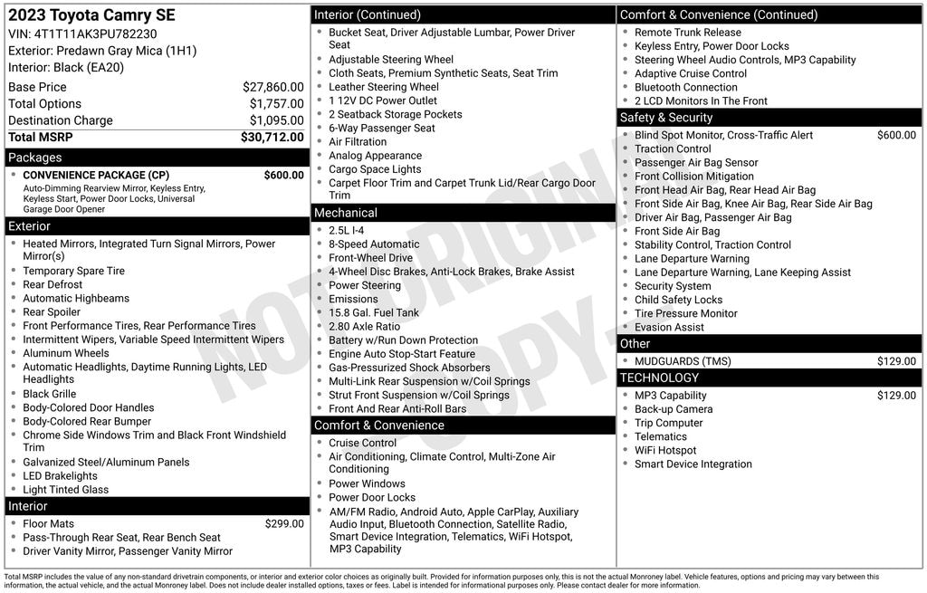 2023 Toyota Camry SE Check out all these great option's ABS brakes, Active Cruise Control, Alloy wheels, Electronic Stability Control, Front dual zone A/C, Heated door mirrors, Illuminated entry, Low tire pressure warning, Remote keyless entry, Traction control, 4-Wheel Disc Brakes, 6 Speakers, 8.0J x 18" Alloy Wheels, Air Conditioning, AM/FM radio: SiriusXM, Apple CarPlay/Android Auto, Auto High-beam Headlights, Automatic temperature control, Brake assist, Bumpers: body-color, Delay-off headlights, Driver door bin, Driver vanity mirror, Dual front impact airbags, Dual front side impact airbags, Emergency communication system: Safety Connect (1-year trial), Exterior Parking Camera Rear, Four wheel independent suspension, Front anti-roll bar, Front Bucket Seats, Front Center Armrest, Front reading lights, Fully automatic headlights, Knee airbag, Leather steering wheel, Occupant sensing airbag, Outside temperature display, Overhead airbag, Overhead console, Panic alarm, Passenger door bin, Passenger vanity mirror, Power door mirrors, Power driver seat, Power steering, Power windows, Radio data system, Radio: Audio, Rear anti-roll bar, Rear seat center armrest, Rear side impact airbag, Rear window defroster, Security system, Speed control, Speed-sensing steering, Split folding rear seat, Spoiler, Sport SofTex Seat Trim w/Fabric Inserts, Steering wheel mounted audio controls, Tachometer, Telescoping steering wheel, Tilt steering wheel, Trip computer, Turn signal indicator mirrors, and Variably intermittent wipers. Recent Arrival! 28/39 City/Highway MPG