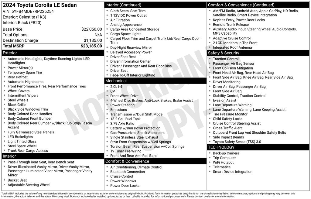This Corolla LE is more than just a practical choice â" it's a testament to Toyota's commitment to quality, innovation, and customer satisfaction. Experience the difference for yourself by scheduling a test drive today. We're confident you'll be impressed by the Corolla LE's blend of style, performance, and value.
