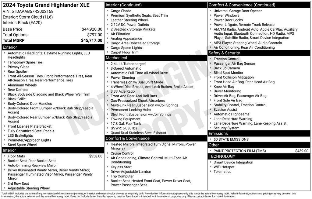 2024 Toyota Grand Highlander XLE Check out all these great option's 18" Aluminum Alloy Wheels, 3.33 Axle Ratio, 3rd row seats: split-bench, 4-Wheel Disc Brakes, 6 Speakers, ABS brakes, Air Conditioning, Alloy wheels, AM/FM radio: SiriusXM, Apple CarPlay/Android Auto, Auto High-beam Headlights, Auto-dimming Rear-View mirror, Automatic temperature control, Brake assist, Bumpers: body-color, Delay-off headlights, Driver door bin, Driver vanity mirror, Dual front impact airbags, Dual front side impact airbags, Electronic Stability Control, Emergency communication system: Safety Connect (up to 10-year trial subscription), Exterior Parking Camera Rear, Four wheel independent suspension, Front anti-roll bar, Front Bucket Seats, Front Center Armrest, Front dual zone A/C, Front reading lights, Fully automatic headlights, Garage door transmitter: HomeLink, Heated door mirrors, Heated Front Seats, Heated front seats, Illuminated entry, Knee airbag, Leather Shift Knob, Leather steering wheel, Low tire pressure warning, Navigation system: Drive Connect Cloud Navigation (1-year trial subscription), Occupant sensing airbag, Outside temperature display, Overhead airbag, Overhead console, Panic alarm, Passenger door bin, Passenger vanity mirror, Power door mirrors, Power driver seat, Power Liftgate, Power passenger seat, Power steering, Power windows, Radio: 12.3" Toyota Audio Multimedia, Rear air conditioning, Rear anti-roll bar, Rear reading lights, Rear window defroster, Rear window wiper, Reclining 3rd row seat, Remote keyless entry, Security system, SofTex Seat Trim, Speed control, Speed-sensing steering, Split folding rear seat, Spoiler, Steering wheel mounted audio controls, Tachometer, Telescoping steering wheel, Tilt steering wheel, Traction control, Trip computer, Turn signal indicator mirrors, and Variably intermittent wipers. Recent Arrival! 21/27 City/Highway MPG