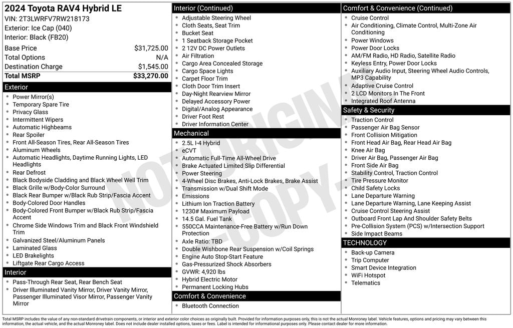 This 2024 Toyota RAV4 Hybrid LE is a remarkable blend of efficiency, versatility, and advanced technology. Experience the confidence and convenience of this exceptional SUV. Visit our showroom today and let us demonstrate how this RAV4 Hybrid can enhance your driving experience.