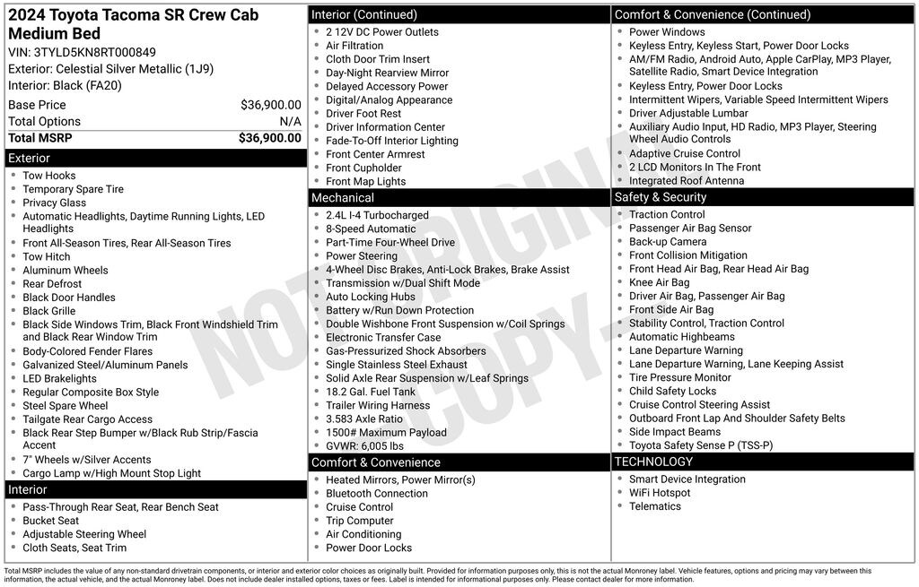 2024 Toyota Tacoma SR Check out all these great option's 17" Steel Wheels, 4-Wheel Disc Brakes, 6 Speakers, ABS brakes, Air Conditioning, Alloy wheels, AM/FM radio: SiriusXM, Anti-whiplash front head restraints, Apple CarPlay/Android Auto, Auto High-beam Headlights, Brake assist, Bumpers: body-color, Driver door bin, Dual front impact airbags, Dual front side impact airbags, Electronic Stability Control, Emergency communication system: Safety Connect (1-year trial), Exterior Parking Camera Rear, Fabric Seat Trim, Front anti-roll bar, Front Bucket Seats, Front Center Armrest, Front reading lights, Front wheel independent suspension, Fully automatic headlights, Heated door mirrors, Illuminated entry, Knee airbag, Low tire pressure warning, Occupant sensing airbag, Outside temperature display, Overhead airbag, Overhead console, Passenger door bin, Power door mirrors, Power steering, Power windows, Radio: 8" Toyota Audio Multimedia, Rear step bumper, Rear window defroster, Remote keyless entry, Speed control, Speed-sensing steering, Split folding rear seat, Steering wheel mounted audio controls, Tachometer, Telescoping steering wheel, Tilt steering wheel, Traction control, Trip computer, and Variably intermittent wipers. Recent Arrival!