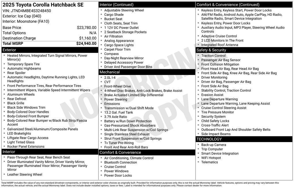Whether you're navigating the daily commute or embarking on a weekend adventure, the 2025 Toyota Corolla Hatchback SE is the perfect companion. Its blend of style, technology, and performance make it a standout in the compact hatchback segment. We invite you to experience the exceptional value and driving dynamics of this Corolla Hatchback for yourself. Visit our showroom today and let us demonstrate why this vehicle is the perfect fit for your lifestyle.